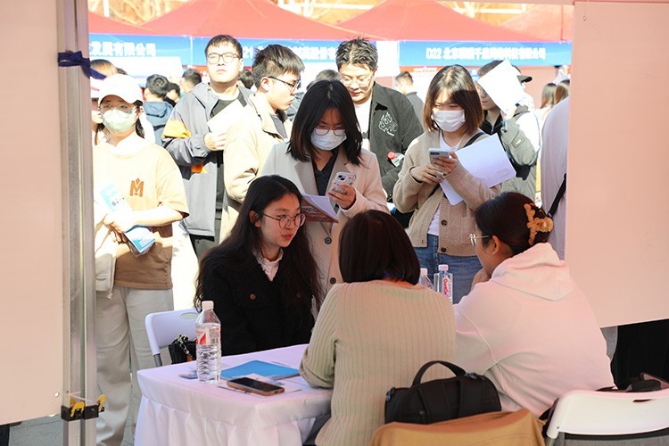 3月22日,京津冀人社部门在保定市河北大学共同举办了第十三届“京津冀招才引智大会”,图为用人单位代表与求职者交流。 河北省人社厅供图