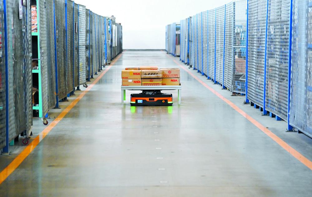 3月20日,在位于石家庄装备制造产业园的石煤机公司,精致小巧的搬运机器人将物料送往生产班组。 记者 张 震 摄