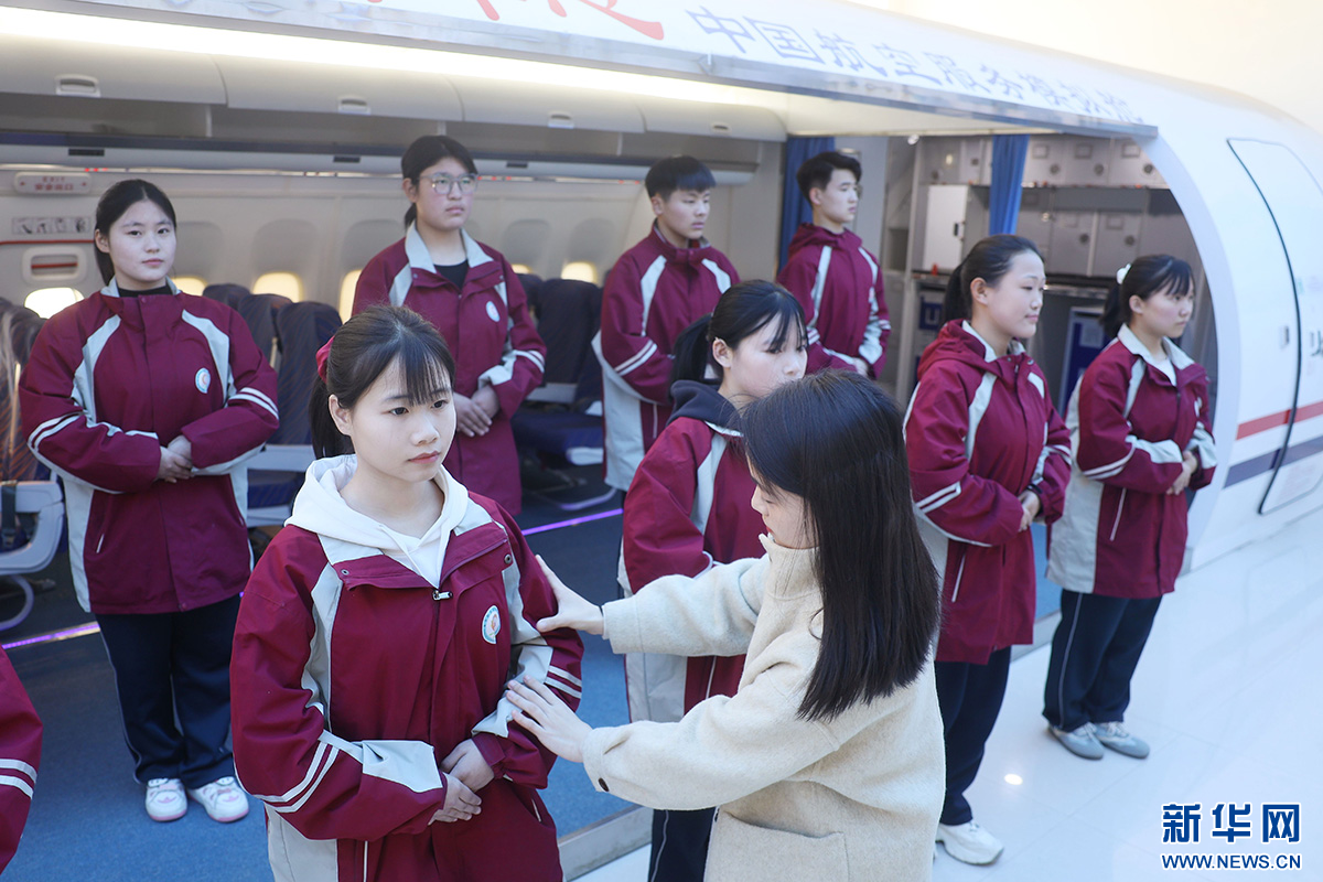 南宫市职教中心航空乘务专业学生在学习礼仪动作。新华网发 田优 摄