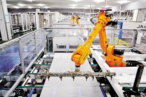 3月28日,晶澳(邢台)太阳能有限公司组件生产车间,智能化生产设备在生产新一代太阳能电池组件。李院红摄