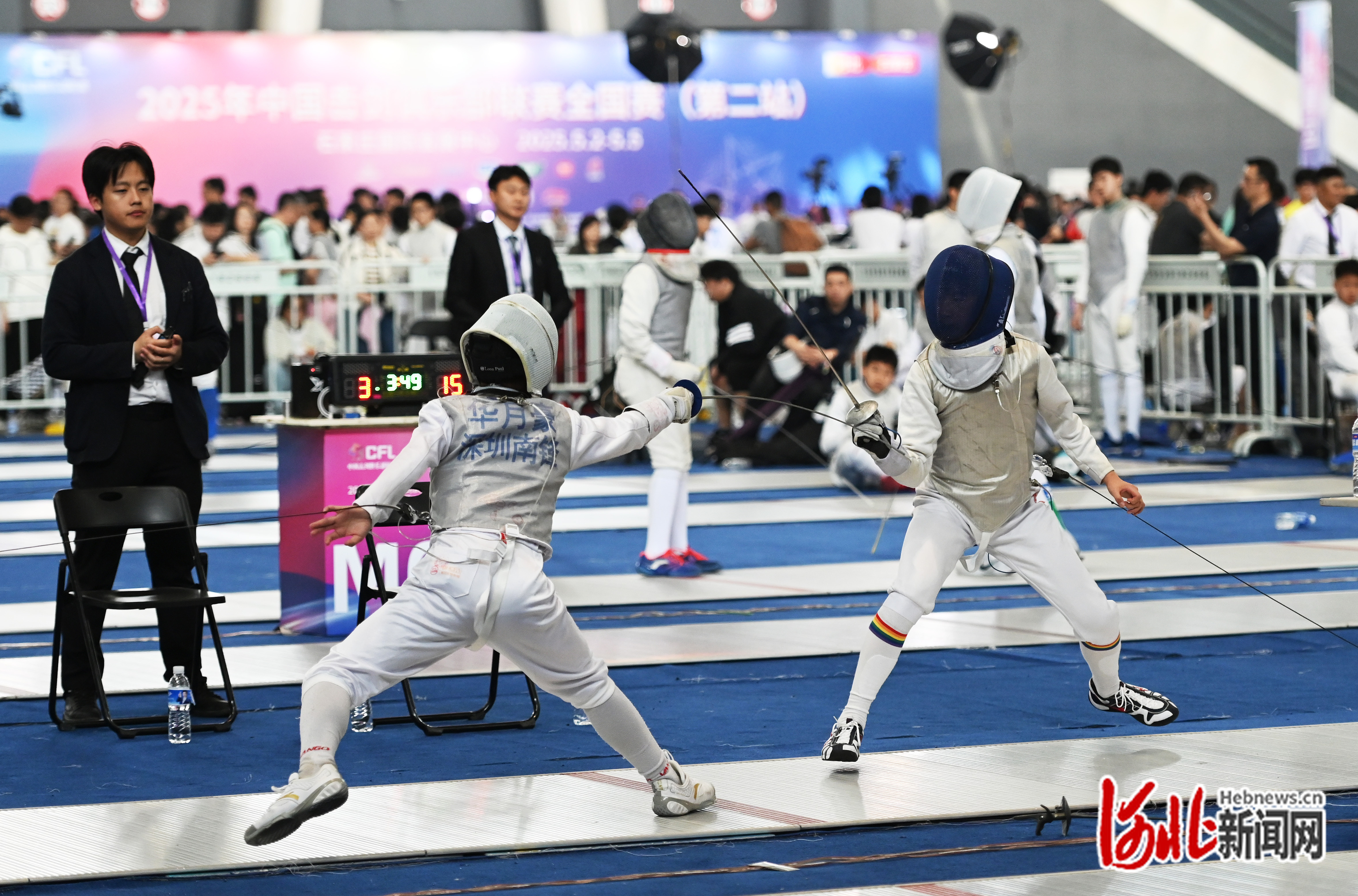 5月2日,2025年中国击剑俱乐部联赛全国赛第二站在石家庄国际会展中心开赛。图为选手在比赛中。 河北日报记者 王伟宏摄