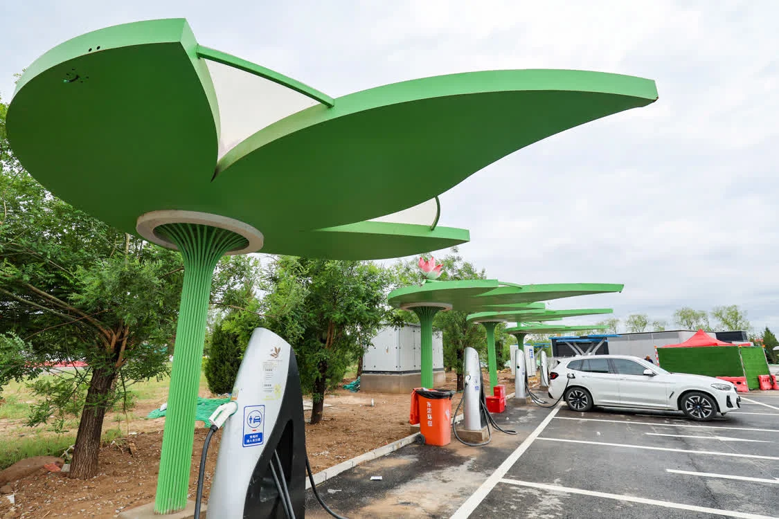 5月9日,新能源车辆在京港澳高速河北段石家庄东服务区的充电区域充电。新华社发(张晓峰摄)