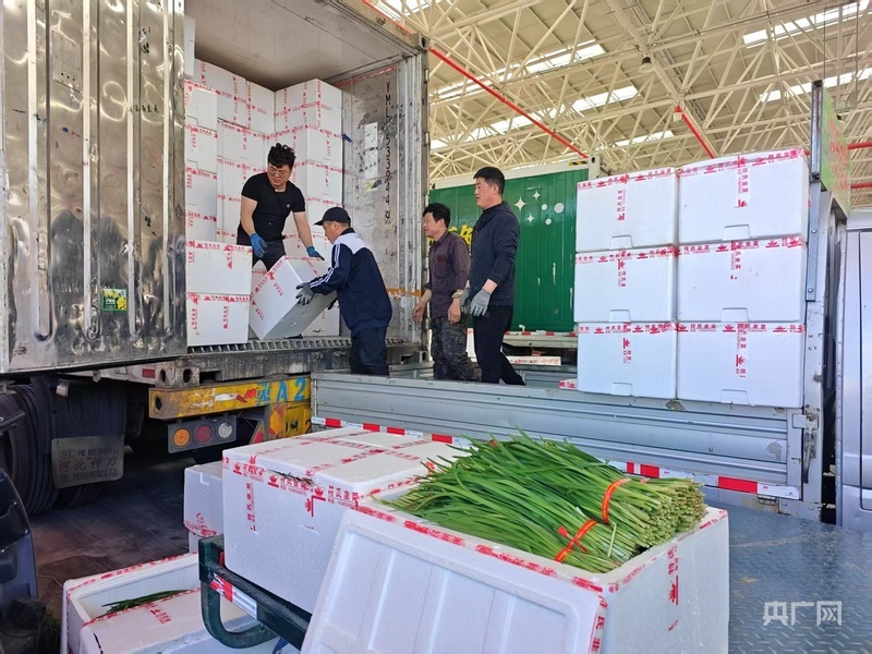工作人员装卸新鲜韭菜,发往京津百姓餐桌(央广网记者 王艺霖 摄)