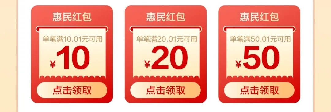 活动首日惠民红包一次性全额投放,单用户活动期间每档红包限领取一张,不可重复领取。