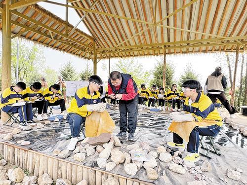 5月11日,在阳原县泥河湾国家考古遗址公园,参加研学活动的当地中学生正体验打制石器用品。 魏国慧摄