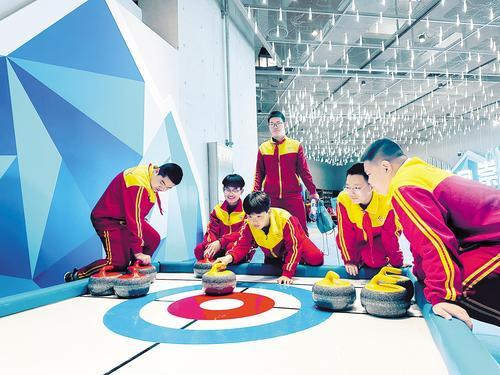 5月1日,宣化区朝阳街小学的学生来到崇礼华侨冰雪博物馆研学旅游基地,开展“探索冰雪与自然之美”研学活动。图为小学生在体验冰壶运动。 张家口市体文旅产业发展集团有限公司供图