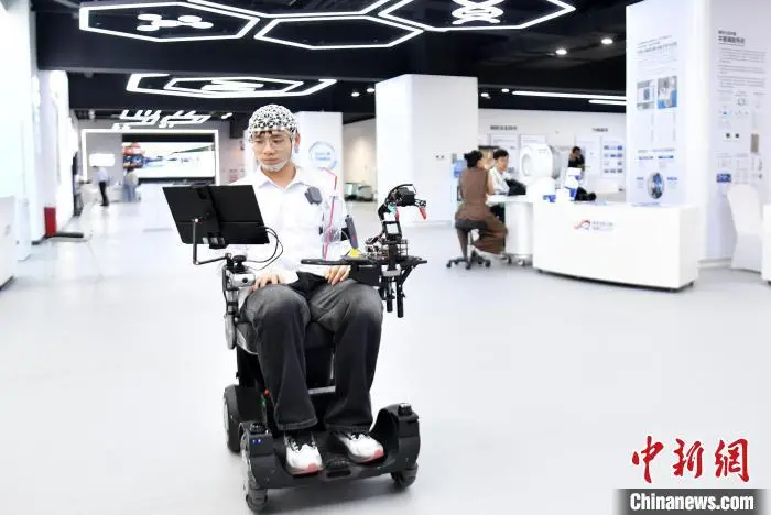 6月10日,雄安未来城市场景体验周上,工作人员演示多模态智能脑控康复轮椅。韩冰 摄