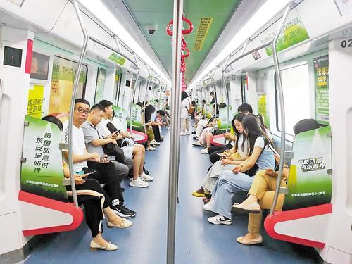 2024年7月4日,华北地区首列国防动员主题地铁专列在石家庄地铁1号线正式上线发车。图为市民乘坐地铁专列场景。(资料片)