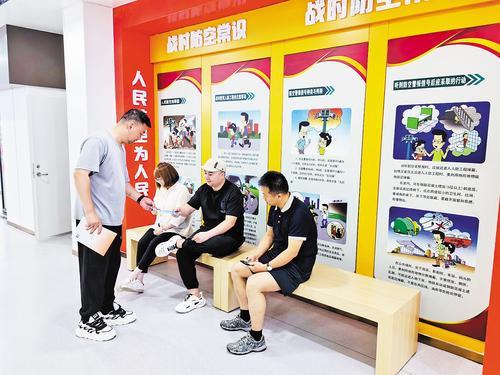 2025年6月23日,在石家庄解放广场人防工程(华北眼镜城)避暑纳凉点,石家庄市国防动员平战结合服务中心工作人员向纳凉群众发放人防知识宣传手册,普及防空防灾知识。