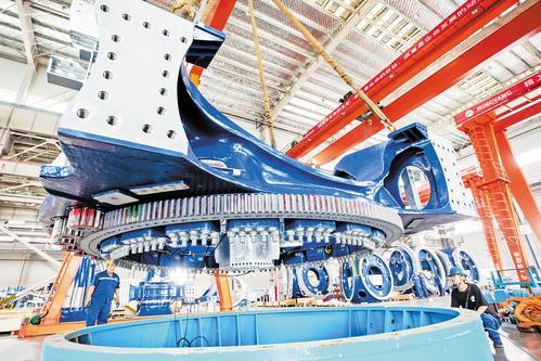 7月9日,在张家口明阳新能源高端装备制造产业基地,工人忙着赶制风电主机订单。 闫凯摄