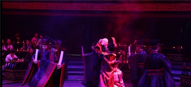 当舞台灯光亮起,编钟轰鸣,演员们身着锦绣华服,重现 “胡服骑射” 的豪迈、“完璧归赵” 的惊险。神奇的是,餐盘里的美食竟与剧情同步 “入戏”—— 蔺相如高举 “和氏璧” 时,“琥珀炆玉环” 泛起温润光晕;太极招式舞动间,龟苓膏的八卦图纹也随之流转,仿佛整个空间都成了历史的舞台!
