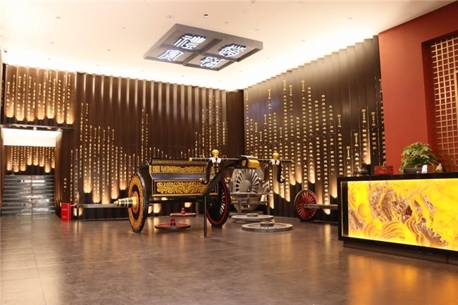 踏入赵都礼宴一楼,仿若瞬间穿越回千年之前。这里有一座精心打造的战国袍博物馆,超百件春秋战国服饰有序陈列,每一件都诉说着战国的时尚脉络。一旁,编钟、七尊鼎、青铜战马等元素,彰显着赵国昔日的辉煌。更有刻着538个邯郸成语典故的文化墙,供宾客打卡留念,浓厚的文化氛围扑面而来。