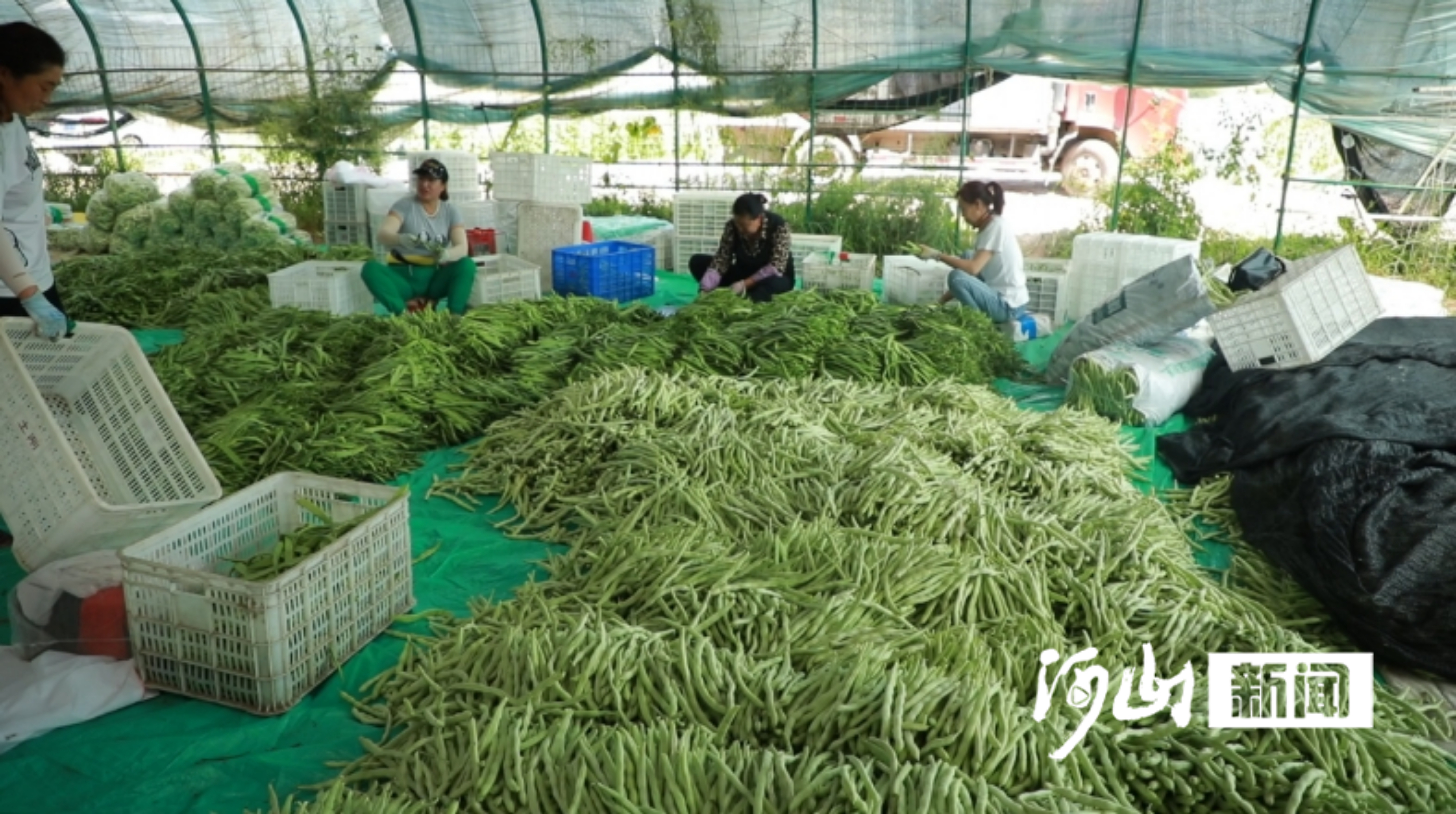 清晨六点的沽源县西辛营乡,架豆地里已经响起此起彼伏的掐断声。菜农郝明指尖捏住豆荚基部轻轻一折,“啪”的脆响里裹着露水——刚摘下的架豆带着淡绿色的光晕,饱满的豆粒在荚内排成整齐的队列。他身后的摘下的架豆渐渐堆成小山,远处的三轮车已经在田埂上候着,准备把这批新鲜架豆送往乡级分拣中心。