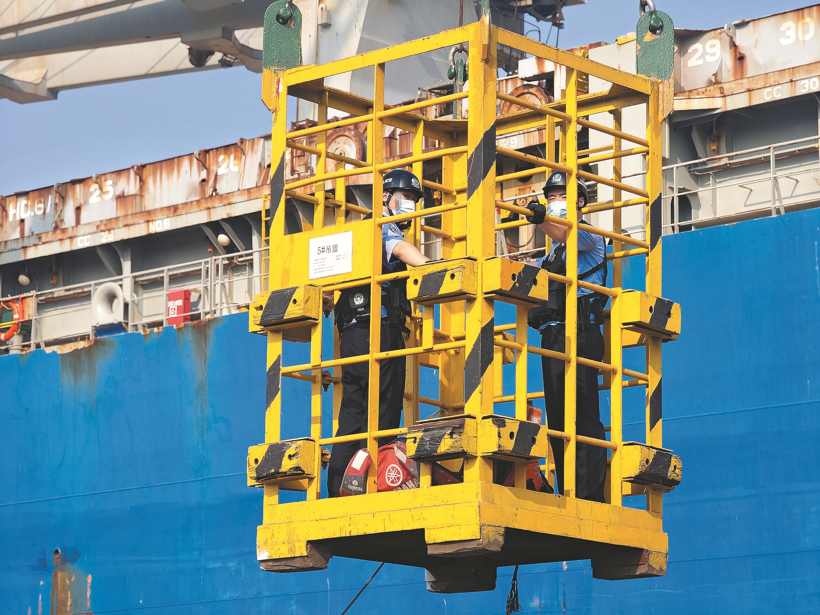 秦皇岛出入境边防检查站民警乘坐吊篮进行船体检查。