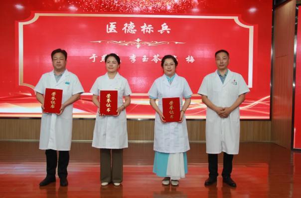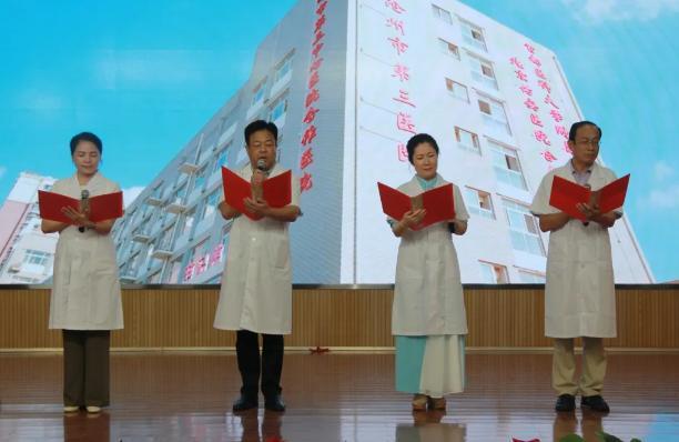 表彰大会还进行了新入职医师授袍、授牌仪式。高永海院长为五位新医生颁发白大衣,高爱华副院长为他们佩戴胸牌。在高爱华副院长的领誓下,全体医师庄严宣誓,彰显了三院人为区域人民健康事业保驾护航的决心和信心。