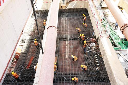 在解放大街站施工现场,记者看到,相当于13层楼高的深基坑内建设场面颇为壮观,八层钢支撑密布其上,钢筋绑扎纵横其中,建设者们各司其职协调配合。