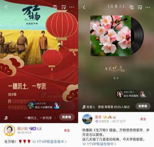 伴随剧集的热播,不少剧迷也来到全民K歌平台挑战这些极富感染力的OST。K歌网友“貓小姐”在“VIP-超级混响音效”加持下演唱《一穗沉土,一岁沉浮》,深情与力量交织,史诗氛围感瞬间拉满;K歌网友“墨菲”则深情翻唱《给爱人》,借助“VIP-远场音质”让声音更通透、更富层次,如同来自远方的呼唤,把爱人之间的温柔与眷恋唱得真挚动人。