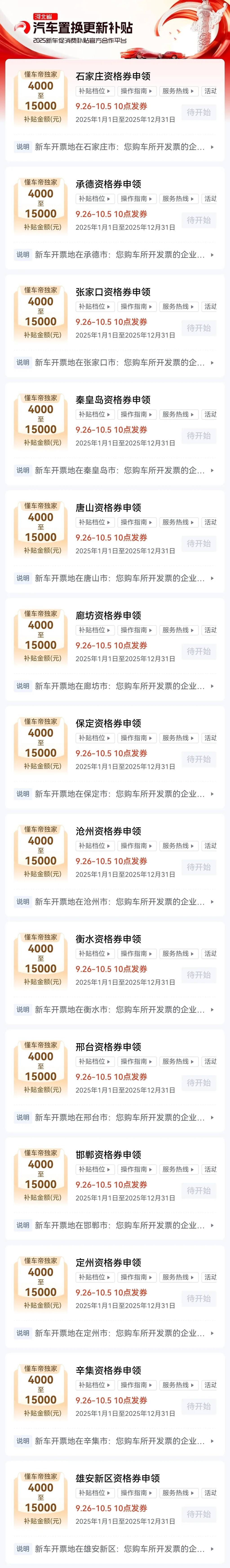 为满足消费者购车需求,有效促进汽车消费,结合汽车置换更新工作,组织开展“金九银十迎国庆,汽车置换促消费”活动。9月26日至10月5日期间,每日上午10:00发放汽车置换更新补贴资格券(有效期截至10月31日)。具体发放端口、发放流程、补贴标准等均以《河北省2025年汽车以旧换新补贴实施细则》《2025年汽车置换更新补贴资格券领取使用流程》为准。