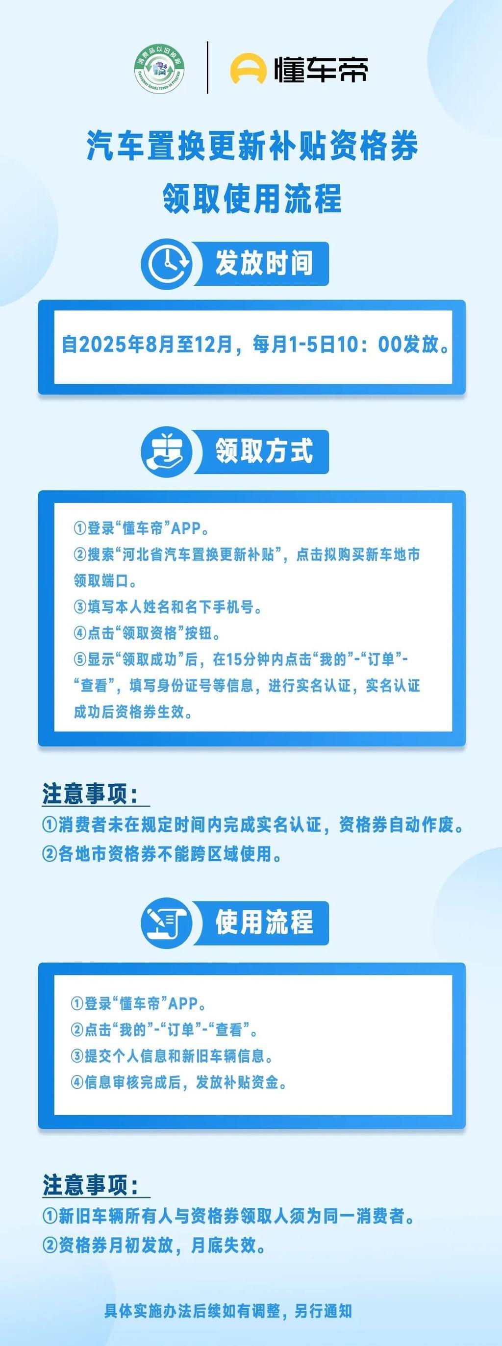 为满足消费者购车需求,有效促进汽车消费,拟结合汽车置换更新工作,组织开展“金九银十迎国庆,汽车置换促消费”活动。9月26日至10月5日期间,每日上午10:00在“懂车帝”App平台集中发放一批汽车置换更新资格券(有效期截至10月31日),补贴资格券数量有限,发完即止。具体发放端口、发放流程、补贴标准等均以张家口市商务局网站发布的《张家口市2025年汽车以旧换新补贴实施细则》《张家口市汽车置换更新补贴资格券领取使用流程》为准。