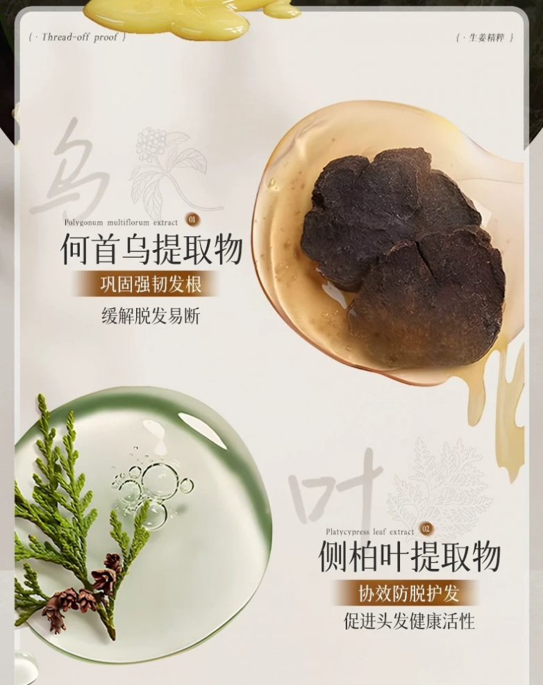 根源控油防脱组合:侧柏叶+何首乌+生姜提取物:这是经过多年民间验证和现代研究支持的经典防脱组合。侧柏叶黄酮有助于抑制5α-还原酶活性,从源头上减少导致毛囊萎缩的DHT生成;何首乌与生姜协同,旨在激活头皮微循环,为发根输送营养,强化发根抓力。