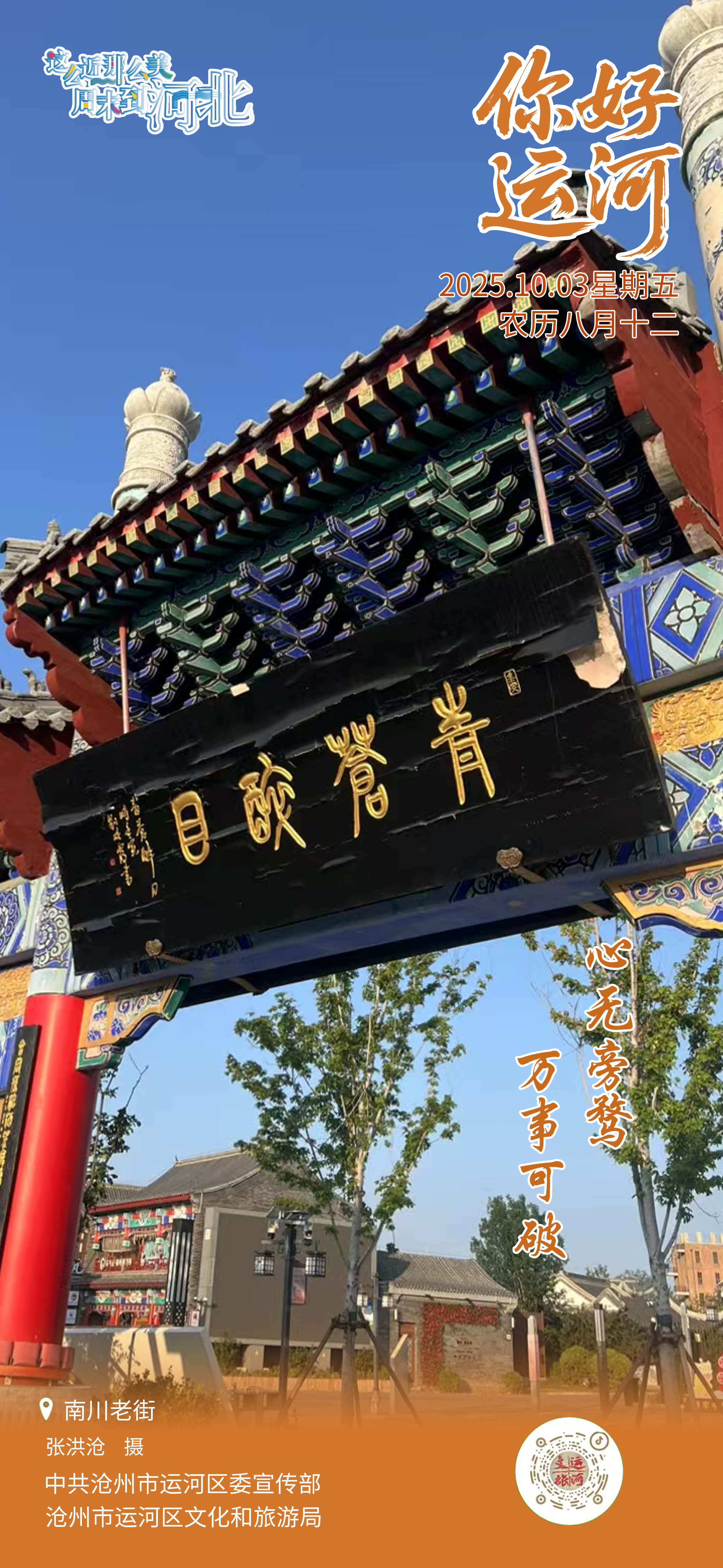 沧州市运河区,是全国唯一以运河命名的县级行政单位。区域内文化旅游资源丰富,园博园、人民公园、南川楼文化街区、百狮园、运河公园串珠成线,中国大运河非遗展示馆、沧州坊、工人文化宫、沧州大化工业遗存文化区应运而生,文庙、水月寺、清风楼、运河码头等珍贵历史遗迹星罗棋布,沧州西部新城“一场五馆”(沧州体育场、博物馆、规划馆、图书馆、体育馆、展览馆)大气恢弘,名人植物园、狮城公园、沧州印象·大运河农业生态文化产业园遥相呼应……