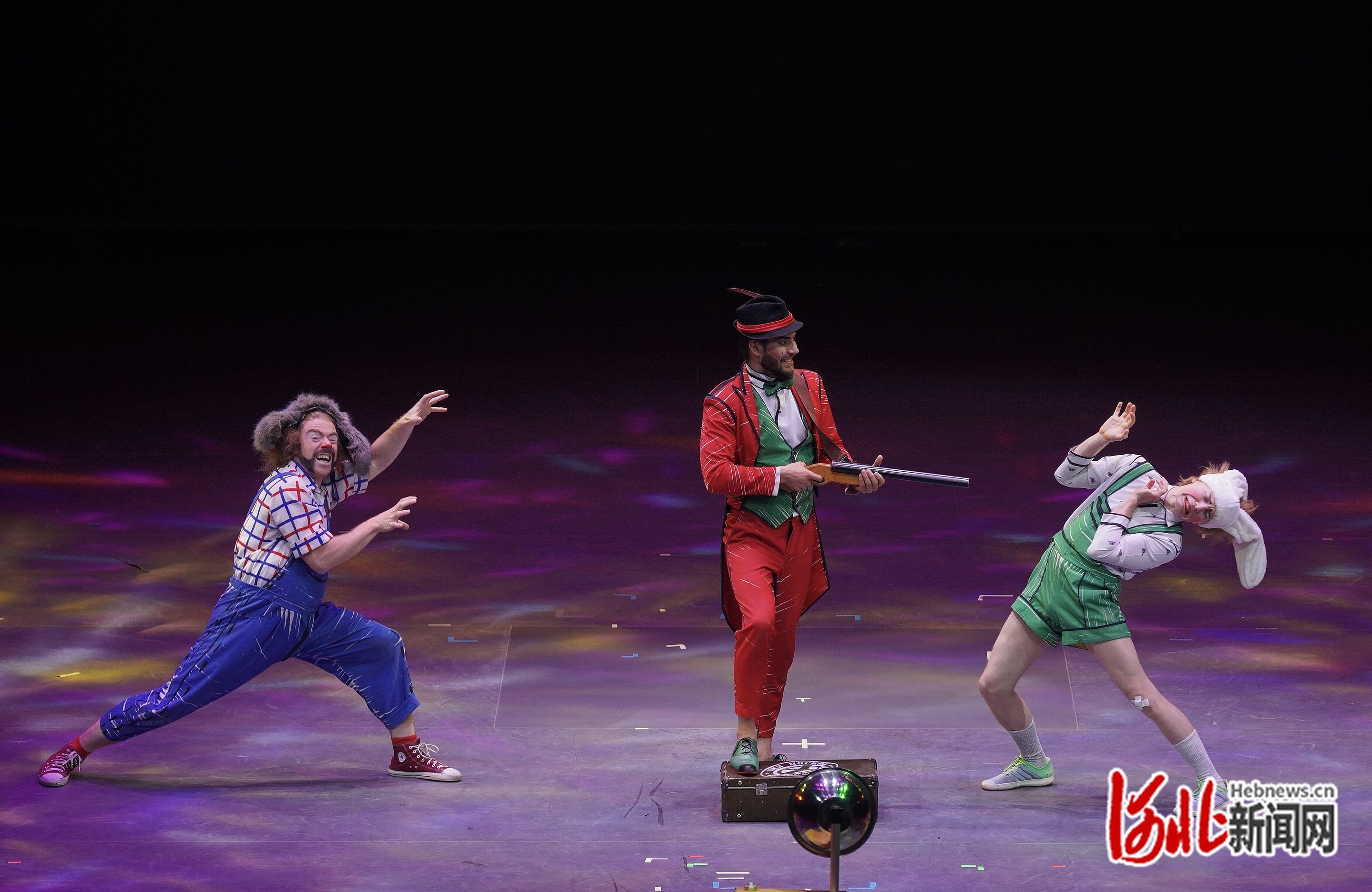 “是谁?”“是他!”俄罗斯“不穿袜子组合”两次登场,红色皮衣,绿色连体裤,黄色爆炸头……滑稽的装扮瞬间吸引全场目光,还会说一些简单的中文与现场观众互动,点燃现场气氛。他们集诙谐幽默与杂技技巧于一身,趣味横生的表演,把观众逗得前仰后合,笑声不断。
