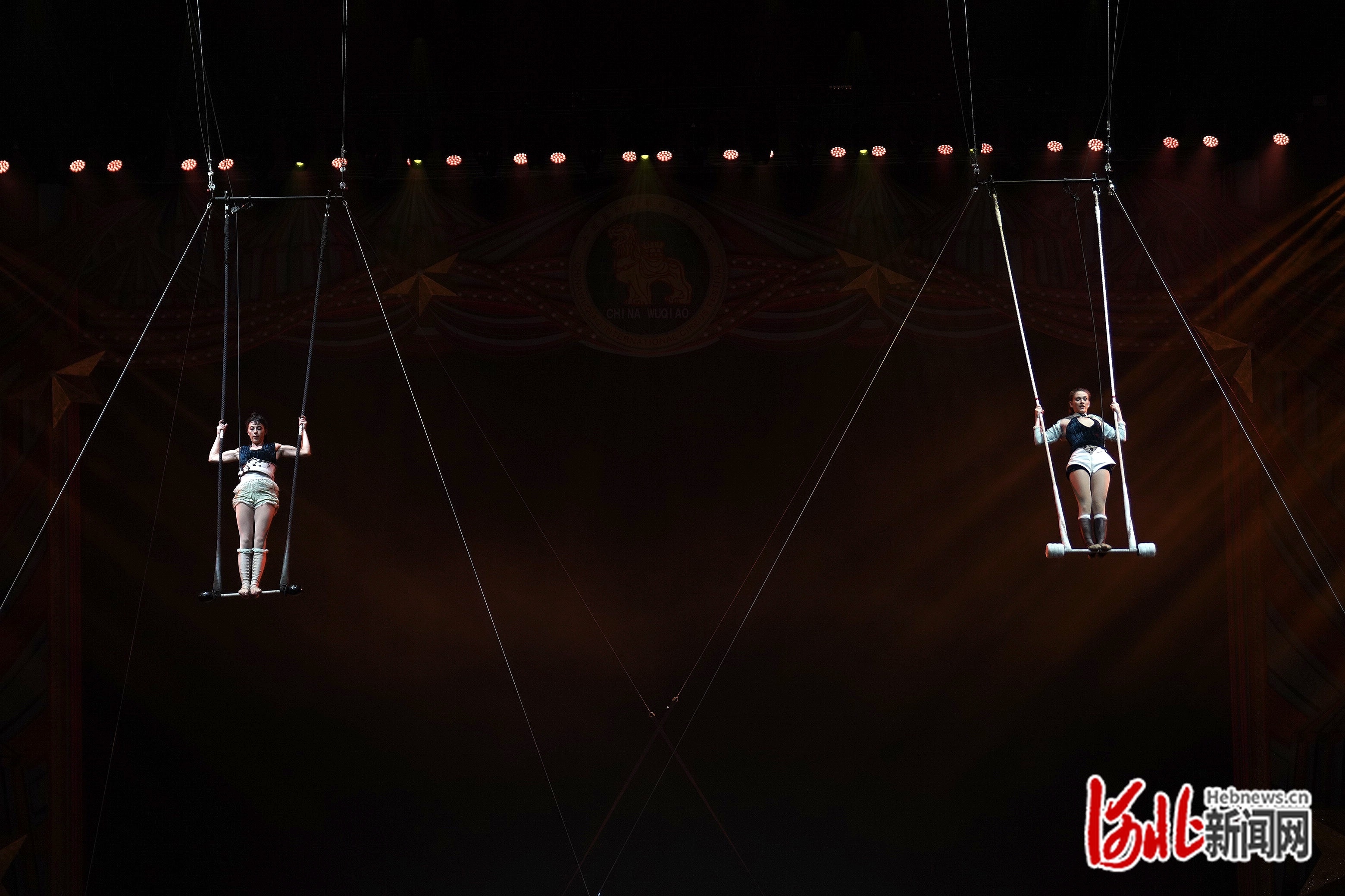 舞台灯光亮起,两名法国女演员站在数米高的秋千上摇晃起来,并做出旋转、空翻等各种高难度的动作,惊险又优美,让观众的目光紧紧追随,不时发出惊叹。