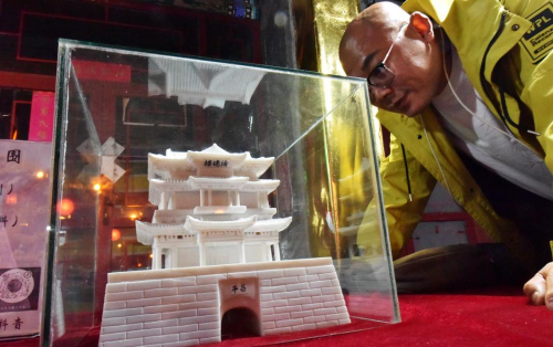 一名游客被一件缩微版清远楼玉雕吸引。陈晓东 摄