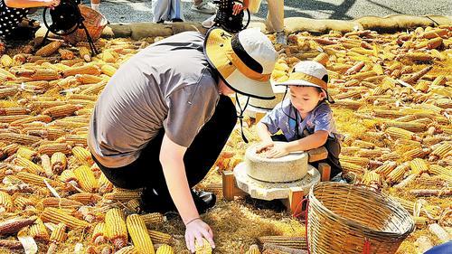 10月1日,恰逢2025年集发丰收节期间,游客在体验秋收的快乐。本报记者 孙也达摄