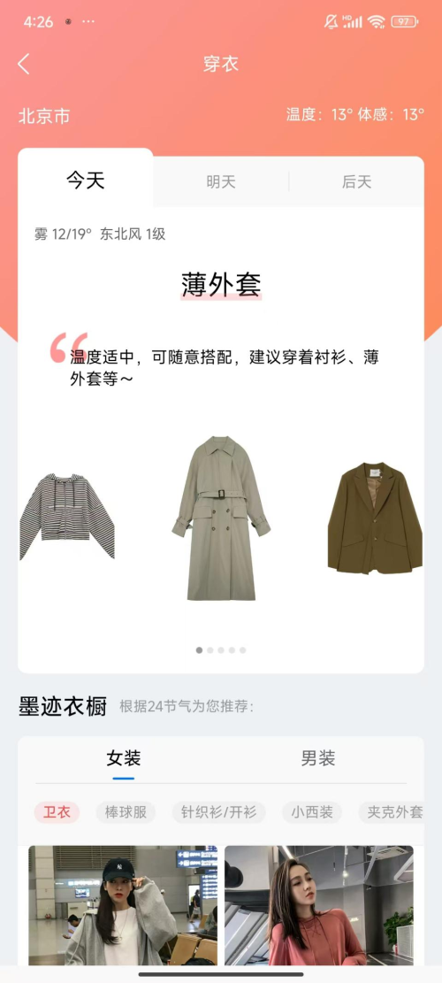 作为拥有7亿装机用户,月活1.5亿用户的天气服务平台,墨迹天气预报依托多源数据融合与自主研发算法,推出的“穿衣指数”功能,该功能并非简单依据气温给出建议,而是综合整合实时气温、湿度、风速、日照等多维度气象数据,通过大数据分析与算法模型生成科学指导。例如,墨迹天气预报会提示“白天温度适中,但早晚气温偏凉,易穿脱的便携外套会很实用”;天气降温时,墨迹天气预报则直接给出“明日降温5℃,建议加一件轻薄外套”,同时搭配“空气干燥,注意补水润喉”的健康提醒。