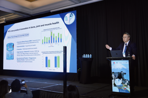 伊利集团总裁助理司徒文佑在峰会上发表《乳制品消费在健康老龄化中的作用》主题报告时指出:乳制品富含优质营养,对改善银发人群健康、应对老龄化挑战意义重大。他进一步介绍:“伊利欣活骨能膳底配方奶粉是基于精准营养理念打造的适老功能乳品,专为应对老龄化背景下的“骨・关・肌”健康需求研发,通过乳制品助力银发人群营养健康。”产品通过高钙(15000mg/kg)搭配维生素D及初乳碱性蛋白CBP锁钙入骨,解决“补钙难吸收”的问题,透明质酸钠助力关节养护,0蔗糖覆盖多元需求。