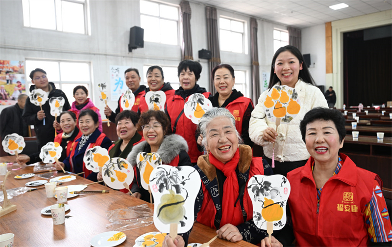 10月24日,定州市福安康日间照料活动中心的老人在展示自己绘制的《福禄如意》团扇。