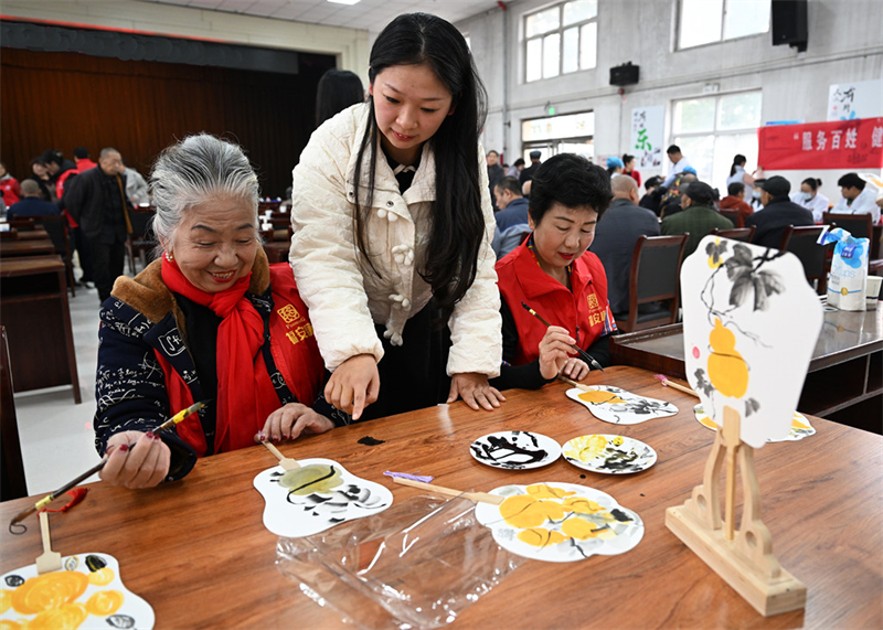 10月24日,定州市妇女手工艺协会志愿者在教福安康日间照料活动中心的老人绘制《福禄如意》团扇。