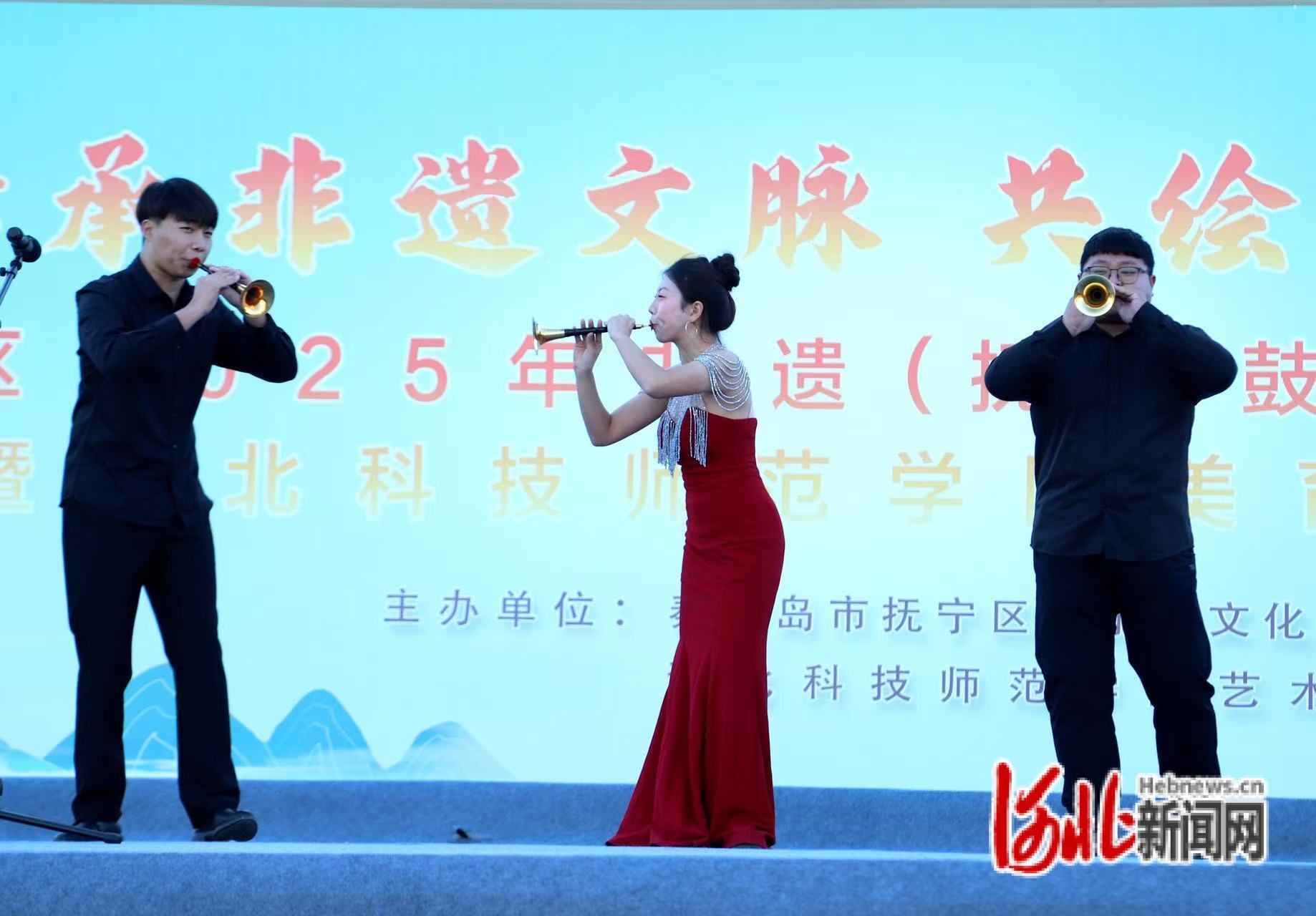 紧随其后的,是国家级非物质文化遗产抚宁鼓吹乐展演。当《柳青娘》的旋律响起,抚宁鼓吹乐团的传承人们手持唢呐、笙、锣等传统乐器登台。熟悉的民间曲调在乐手们的演绎下愈发悠扬婉转,细腻的演奏技巧让在场师生惊叹不已。“原来传统乐器能演奏出这么丰富的音色!”来自机电工程学院的学生王韩博一边用手机记录,一边兴奋地说。