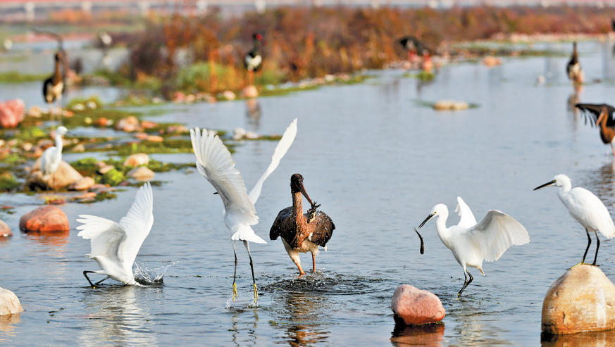 水清了,草绿了,鸟也来了。统计显示,目前绵蔓河流域已有200多种鸟类来此栖息。其中,国家二级以上保护鸟类种群扩大至38种,被誉为“鸟中大熊猫”的黑鹳,数量已增至160余只。