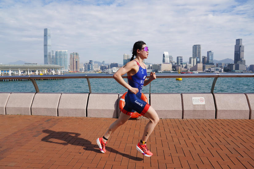 11月15日,黄安琪在跑步比赛中。最终,她获得冠军。当日,第十五届全国运动会铁人三项女子个人比赛在香港举行。 新华社发(王申摄)