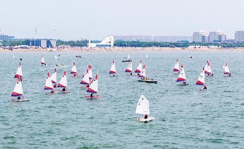 6月1日,秦皇岛市北戴河新区蔚蓝海岸,2025年ILCA亚洲(公开)帆船锦标赛运动员在训练,为滨城增添了一道亮丽的风景线。 本报记者 赵杰摄