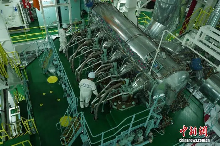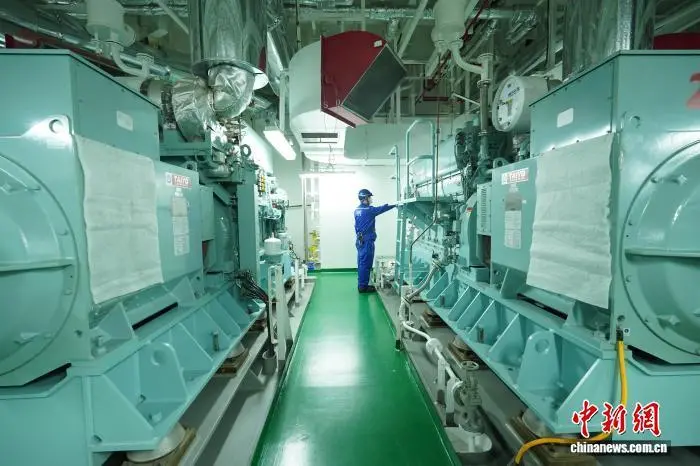 图为工作人员在机舱内检查主机设备。王继军 摄
