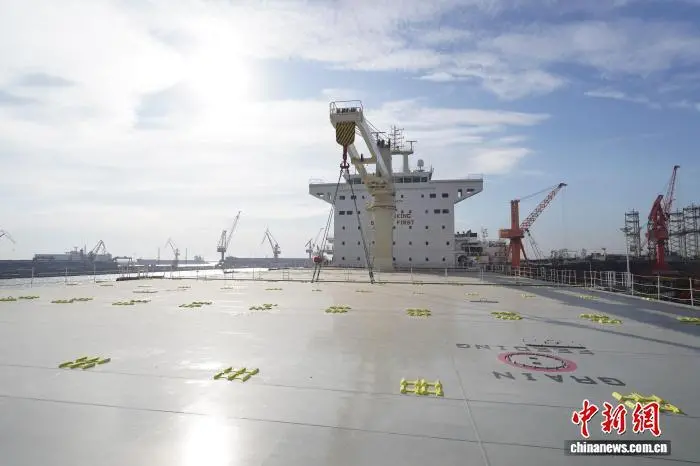 12月5日,8.45万吨级多用途纸浆船“CSPC NEPTUNE”(海王星)轮在河北秦皇岛山海关港3号码头正式完成命名交付,这是河北目前建造的最大多用途纸浆船。该船舶总长225米,型宽36米,型深21.05米,航速15.5节,续航能力达到25000海里,入级CCS船籍社。它具备极强的适应性和装载效率,除了可运输纸浆外,还可适装高铁列车、风电设备、新能源汽车、大型机械设备等多种货品。图为命名交付的8.45万吨级多用途纸浆船“CSPC NEPTUNE”(海王星)轮。王继军 摄