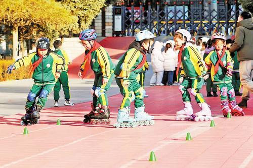 11月18日,张家口市桥东区东风小学学生在进行轮滑训练。岑屹摄