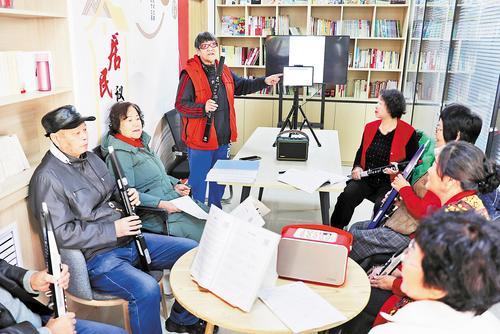 10月21日,在张家口市桥东区商务街社区活动室内,几位老人在学习演奏电吹管。岑屹摄