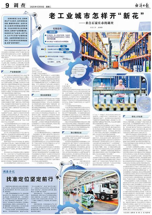 12月9日,《经济日报》推出整版报道《老工业城市怎样开“新花”——来自石家庄市的调查》。报道介绍,作为老工业城市的典型代表,石家庄重新定位产业方向,通过强化项目、创新、园区、营商环境、人才等支撑,打造生物医药、新一代电子信息、先进装备制造、现代食品、现代商贸物流五大千亿元级产业集群,构建起具有特色优势的产业发展“四梁八柱”。该市强化创新驱动,深化政校企合作,2024年度石家庄创新能力在全国103个创新型城市中上升了10位;推行“陪办团”服务与招投标“双盲”评审,着力打造市场化、法治化、国际化一流营商环境;实施“15条人才新政”,吸引青年人才持续流入,连续3年获评“中国年度最佳引才城市”。