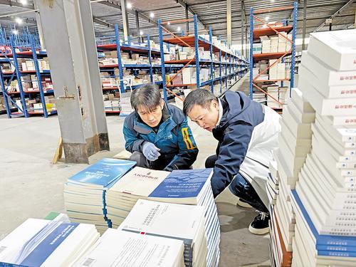 12月2日,在涿州京南图书文化产业园的仓库里,北京集文天下文化发展有限公司总经理邹斌(右)正在查看客户订单的备货情况。本报记者 李巍摄