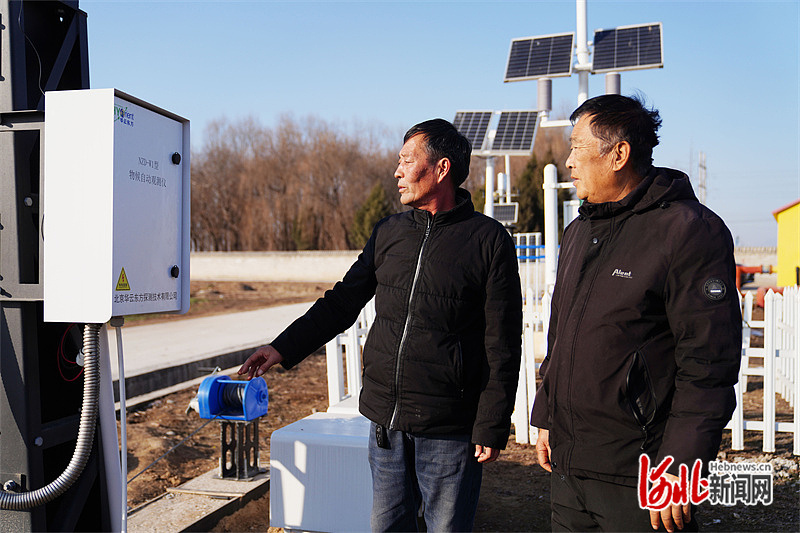 12月24日,中国农业大学涿州教学实验场一分场技术员何玉彬(左)在给种粮大户李刚介绍智能化农情监测设备。河北日报记者 张晶摄