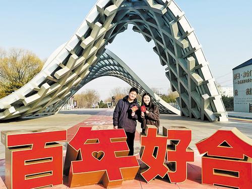 12月15日,邢台市任泽区一对新人领取结婚证后在邢泽湖畔厚德·和合门前留影。 本报记者赵永辉摄