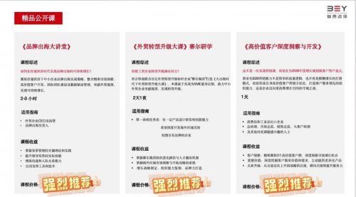 其中精品公开课里值得推荐的课程有《品牌出海大讲堂》、《外贸转型升级大课》赛尔研学和《高价值客户深度洞察与开发》。《品牌出海大讲堂》聚焦存量经济下中小企业品牌出海实战策略,整合精准市场洞察高价值客户开发、国际团队建设及数据驱动管理,突破外贸瓶颈实现可持续增长。《外贸转型升级大课》赛尔研学基于实战为SME量身定制,助力中小外贸企业突破瓶颈,实现转型升级。《高价值客户深度洞察与开发》课程中介绍了职业化B2B营销能力不是简单的流量逻辑,也不再是模糊增长的打猎模式,而是形成自身高价值客户营销方法论,打造客户服务领先的组织能力,这是企业迈向更高维增长空间的守城之战。