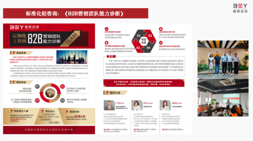 标准化轻咨询产品体系中包含《B2B营销团队能力诊断》、《高价值客户增长策略》等核心课程。其中《B2B营销团队能力诊断》专为B2B外贸企业设计的定制化诊断服务,通过科学诊断模型,诊断企业现有国际业务团队和管理能力,精准识别大客户营销方面的短板、团队优势以及提升空间,从而驱动销售增长和市场竞争力。