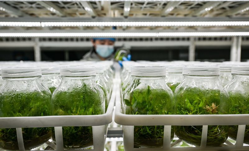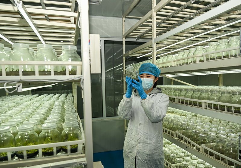 1月9日,在张家口市加禾农业科技有限公司组培中心,工作人员查看铁皮石斛幼苗长势。