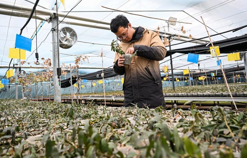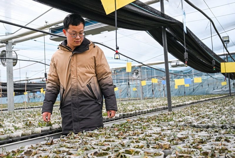 1月9日,在张家口市加禾农业科技有限公司大棚,工作人员查看铁皮石斛长势。