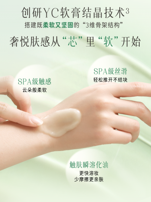使用肤感的创新设计,让卸妆过程成为一种舒适享受。产品采用 YC 软膏结晶技术,以天然蜂蜡与合成蜡构建 3 维骨架结构,触感如云朵般柔软细腻。触肤瞬间即化为丝滑油状,快速包裹彩妆并溶解,按摩时能温和带走黑白头,且全程不糊眼、无刺激感。搭配 DSET 极能双相自乳化技术,无需额外乳化步骤,无论冷水、温水都能轻松冲洗干净,洗后肌肤清爽无膜感,彻底摆脱油腻残留的困扰,让卸妆流程更便捷、更舒适。